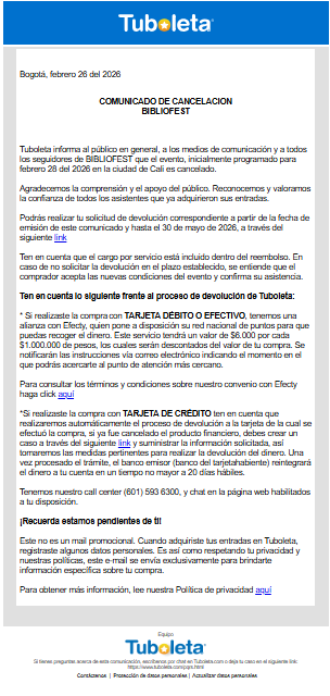 La Fundación BiblioTec se permite reproducir la información enviada por parte de Tuboleta.com a las personas que habían comprado entradas para el BiblioFest 2026. La cual les fue enviada a través de mensaje de texto y correo electrónico. Podrás realizar tu solicitud de devolución correspondiente a partir de la fecha de emisión de este comunicado y hasta el 30 de mayo de 2026, a través del siguiente link